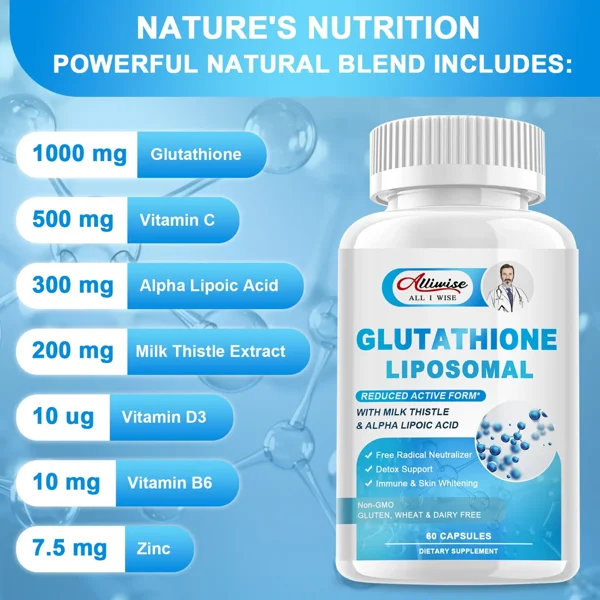 Alliwise Liposomal Glutathione Supplement is a high-absorption antioxidant formula designed to support detoxification, immune health, and skin radiance. Using advanced liposomal delivery technology, glutathione is better absorbed and utilized by the body compared to regular capsules. This supplement helps protect cells from oxidative stress, supports liver function, and promotes overall wellness for daily use.